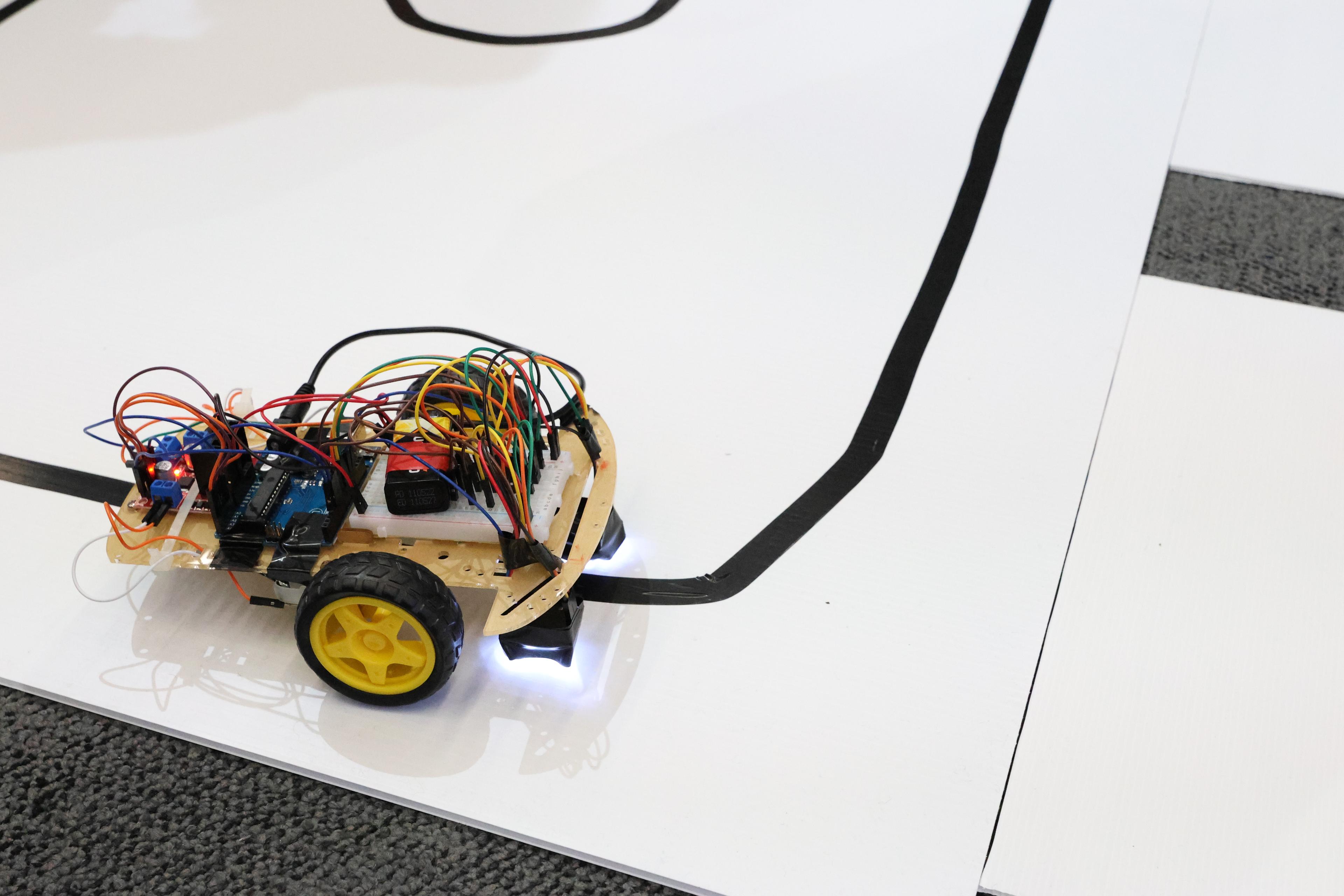 With every team given identical components, construction, design and most importantly good software separated teams apart. At the end of 2 days, 40 teams had completed a robot, although to various levels of success, with some robots struggling to follow a straight black line and with other confidently manouevring tight turns and taking coloured shortcuts.